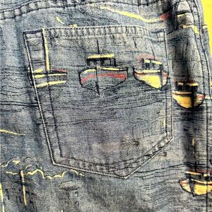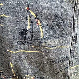 Perfect classic denim skirt by Liz Claiborne in light wash with nautical (ships) screenprint design. Front button and zip closure, 5-pocket design, belt loops, kick pleat. 100% cotton.