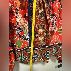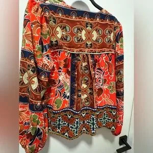This relaxed blouse from On The Road features a striking red base with intricate graphic patterns in black and cream. The 3/4 sleeves and bib collar add a touch of elegance to its bohemian style, making it a perfect choice for a casual yet chic look.