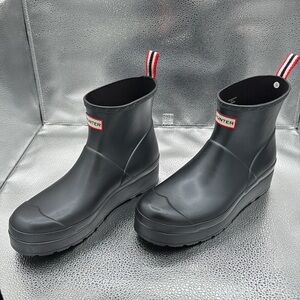Sleek charcoal platform boots by Hunter. Ideal for wet weather.
