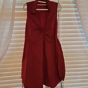This cute mini burnt red dress is perfect for any occasion. Its vibrant color and stylish design make it a must-have in your wardrobe. Adjustable bow ties on side, ruched front neck