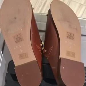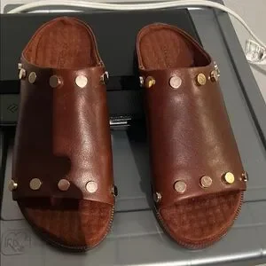 Experience the perfect blend of style and comfort with Kelsi Dagger's brown leather sandals. Featuring a wide leather strap adorned with metallic studs, these sandals offer a classic yet modern look. The open-back design ensures easy wear, making them ideal for casual outings. Worn a few times. Natural scuff marks shown in photos.