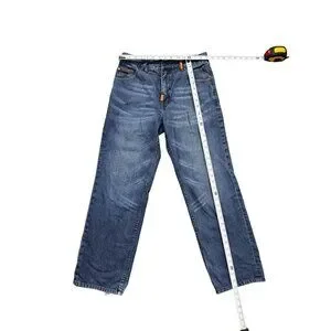 Back hems distressed, otherwise in good condition. Inseam = 30 inches, waist = 32 inches, top to bottom = 40 inches.