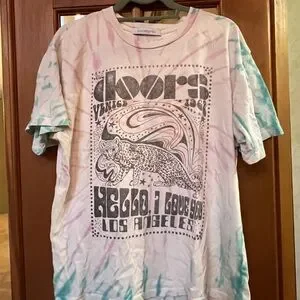 Colorful tie-dye t-shirt with a bold graphic design. Features a mix of pink, blue, and white hues.