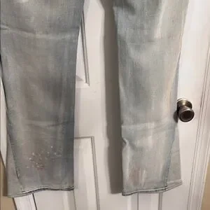 Stylish flare and wide leg jeans. Light blue wash with the brown and white paint splatter Perfect for casual wear.