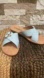 These elegant blue sandals by Soda features a chic gold accent. Criss-cross upper with gold-tone buckle accents. Slip-On access. Excellent condition