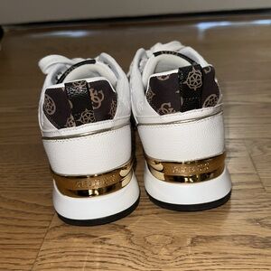 NWOT. Guess Woman’s “Kaddy” White Leather Sneakers with Gold Details. Size 8.5