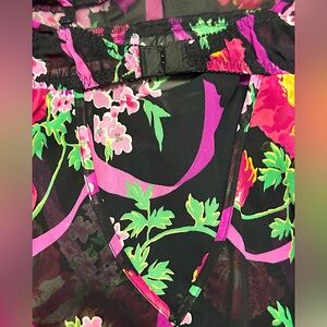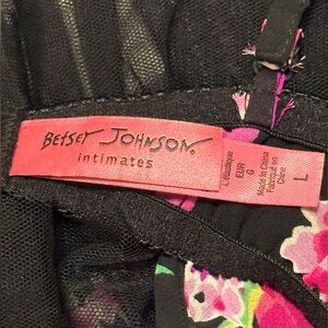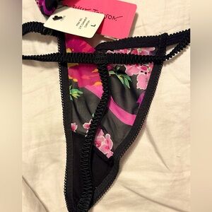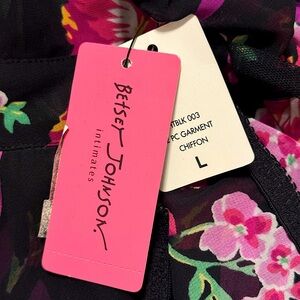 New with tags Betsey Johnson 2 piece matching set. Chic black nightgown with vibrant pink floral patterns. Adjustable straps and back closure. Matching thong. Size Large