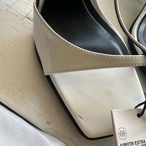 These Zara heels feature a sleek square-toe design with thin straps, offering a minimalist and modern aesthetic. The striking contrast between the white upper and black insole adds a touch of sophistication, making them perfect for formal occasions.