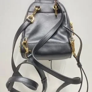 This Michael Kors backpack showcases a bold black and green design with a striking Mickey Mouse-style silhouette. The gold studded embellishments and hardware add a touch of elegance to its structured shape, making it a standout accessory for any occasion.