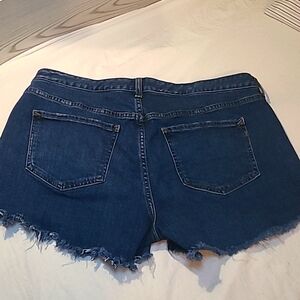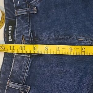These Express jean shorts feature a classic blue color with a distressed, frayed hem for a casual, worn-in look. Made from traditional denim, they offer a medium-dark wash that adds a touch of style to any casual outing.
