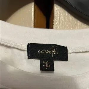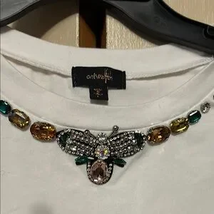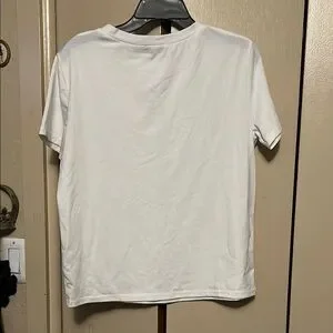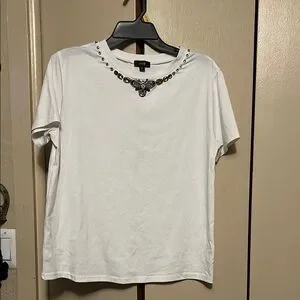 This stylish white tee features a beautifully embellished V-neckline, adding a touch of elegance to its casual design. Made from a soft cotton blend, it offers a relaxed fit perfect for everyday wear. The short sleeves and decorative details make it a versatile addition to any wardrobe.