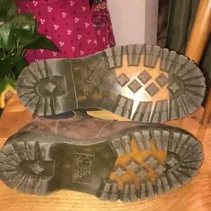 Stylish brown leather boots by Dr. Martens. Features a classic design with yellow accents.