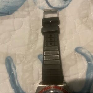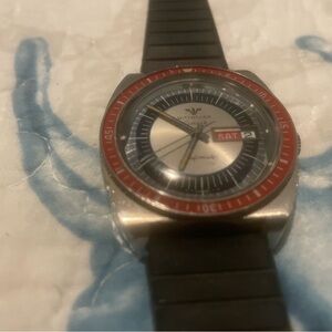 Elegant Wittnauer watch featuring a silver face with red accents. Includes a black strap and day-date display.