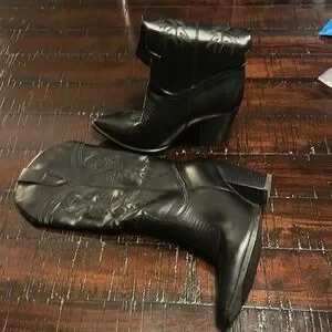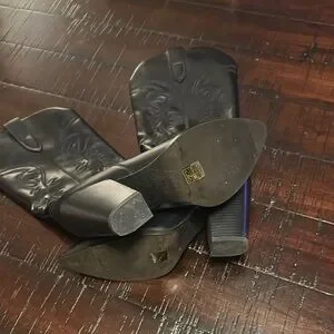 These black heeled boots showcase a chunky heel and a slouchy shaft, capturing the essence of Western style. Crafted from smooth leather, they feature a slightly pointed toe for a refined look.