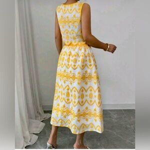 Embrace the sunny vibes with this sleeveless top and lined skirt, featuring a striking yellow and white geometric pattern. The neckline and fitted bodice top and the full gathered skirt, making it ideal for casual outings or resort getaways. Skirt has elastic on the waist in the back. Top laying flat measures approximately 19-20” from PTP, Crafted from a light, breathable fabric, this skirt set ensures comfort and style in warm weather. Bright and happy.