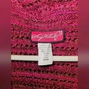 Say What? Cardigan sz Med open front, crocheted, 3/4 sleeve