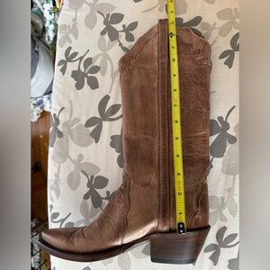 @poopsiepie Hi, they are around 13” tall. I’m going to add a photo so you can see where I took my measurement. I personally have 2 pairs of Lucchese boots and that are my regular size. You might want to check their website and see what they say and their reviews. The boots are beautiful and I wish they fit me.