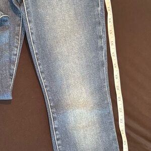 These high rise jeans from Good American feature a classic blue wash with natural fading and whiskering patterns, offering a vintage-inspired aesthetic. The denim showcases a straight or slightly tapered cut, providing a flattering silhouette. With its authentic lived-in appearance, these jeans are perfect for adding a touch of timeless style to any casual outfit.