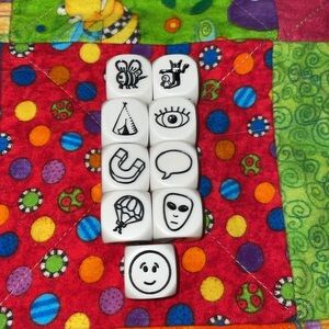 Rory's Story Cubes set with an orange pouch. Includes dice with various symbols. All dice cubes & carrying bag are in excellent condition. Smoke & pet free home.