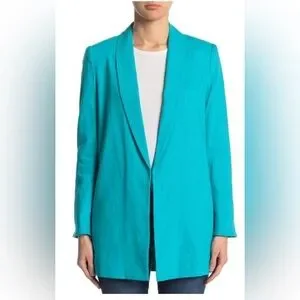 This Alice + Olivia blazer in a striking turquoise features a relaxed, longline silhouette perfect for layering. Its minimalist design and lightweight fabric make it an ideal choice for spring or summer wear, adding a touch of elegance to any outfit.