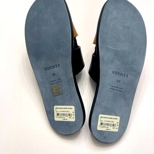 These Hermes sandals feature a sleek two-strap design in luxurious black and brown leather, offering a minimalist and modern aesthetic. The flat sole ensures comfort, making them perfect for both casual and upscale occasions. Presented in a branded box, they exemplify elegance and sophistication. rare colour combination SizeEU44