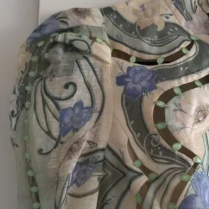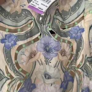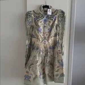 This elegant Zimmermann sundress features a mock neck and long sleeves, perfect for a wedding guest or cocktail occasion. The dress showcases a beautiful blend of tan and blue hues in a paisley and floral print, with a fitted bodice that flows into a flared skirt. Its lightweight fabric and vintage-inspired design offer a sophisticated and timeless look.
