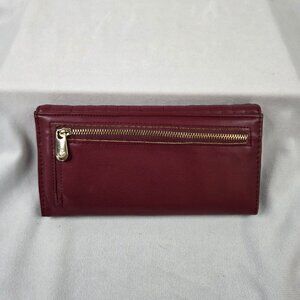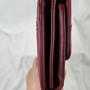 Very good condition - Women's wallet with snap closure, 1 zippered back pocket, 2 interior pockets, 12 card slots, and 1 window ID slot. Has one minor stain in lining of back zippered pocket - see photo. 8"x4"