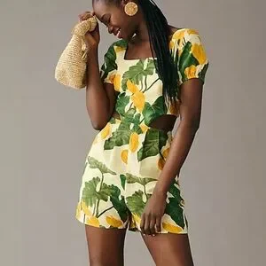 Pre-loved. Yellow anthuriums adorn this linen and viscose blend romper. Adorable. Has pockets.
