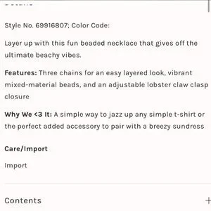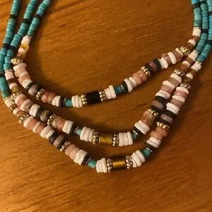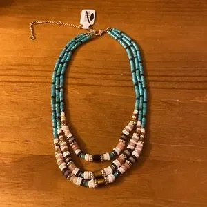 Vibrant beaded necklace. Features turquoise, pink, and gold beads. Layered design for a bohemian look.