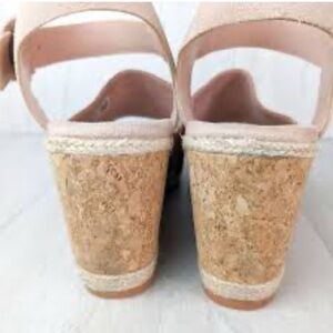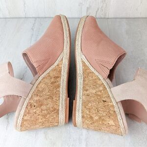 Experience the perfect blend of style and comfort with these Toms pink sandals. Featuring a soft blush hue, these sandals boast a perforated leather upper and a chunky cork-like sole for a modern, casual look. The open toe and secure ankle strap make them ideal for warm-weather outings.