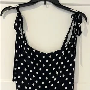 This Reformation sundress features a chic black and white polka dot pattern, perfect for a casual night out. The sleeveless design and scoop neckline offer a breezy feel, while the midi length adds a touch of elegance. Crafted for comfort with elastic through back side, and adjustable tie straps. Beautiful flowy material. Worn 1 time.