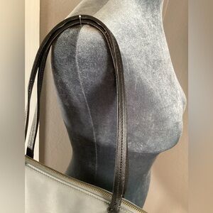 Nylon tote bag with zipper closure. Handles in good shape only minimal wear , some spots on exterior…please see all photos for bags overall condition. Measurements are approximate and were taken lying flat. 10 inches wide, 9.5 inches long, 5 inches deep. Smoke and pet free home.