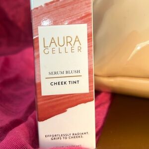 Stylish Marc Jacobs cosmetic bag in a glossy beige finish. Perfect for organizing your essentials. The bundle includes Laura Gellar serum blush cheek tint and Laura Gellar jelly balm hydrating lip color. One callout on the makeup bag shown in the pictures.