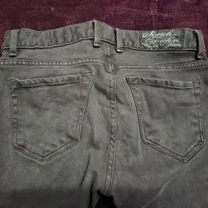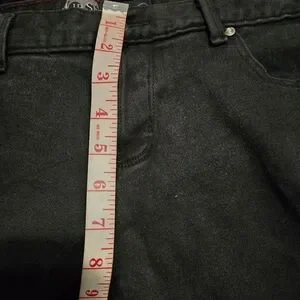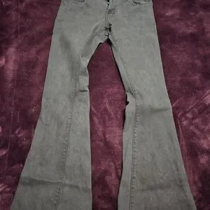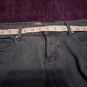 Very good used condition from a smoke free, cat friendly home. No damage to hems. All hardware intact and in great shape. They are solid black, not grey. The last photos are more representative than the first, which is overexposed to show detail. Waist-30", rise-8.5", inseam-32", as shown in pictures.