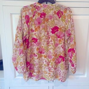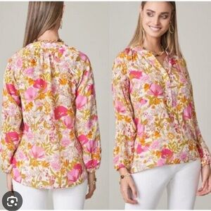 Like New Spartina 449 Cora Silk Blouse in Heywards Rate floral. The classic, silk blouse Spartina style: Our floral bouquet pattern topped with shirring around the neckline and accented by a trail of pearly faux shell buttons. Smart side slits along the hem for comfort and elastic sleeve openings to create a subtle billow. And it's absolutely beautiful tucked into linen trousers or flowing over your Maren Pull-On Pants.