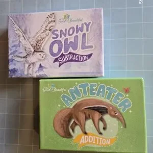 This one-of-a-kind original game offers great math fact practice for children in grades K and higher. Two games offered in both single-player or two-player options help children practice facts independently or with a parent or partner. Subtraction facts 1–9 are practiced along with one more and one less. This game is recommended to complement the Simply Good and Beautiful Math K Course along with Anteater Addition. These games can also be used for children in Math 1 and above for additional practice and mastery. Full-color sturdy 5"x3.5" box includes: