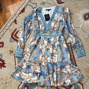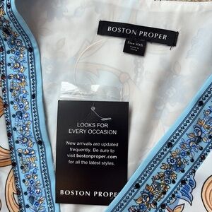 Gorgeous and romantic! New with tags! $169 Boston Proper chain/scarf print blue white and gold lined long sleeve spring dress. Embellished jeweled sequin at V neckline. So romantic! XXS best for a 0 or 2.