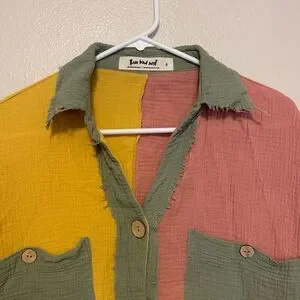Embrace a playful yet sophisticated look with this Three Bird Nest button down shirt, featuring a delightful blend of pink, green and yellow hues. The color-blocking design adds a modern twist, making it a standout piece for casual outings. Crafted with attention to detail, this shirt offers both style and comfort.