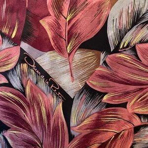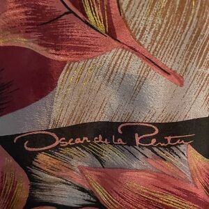 Elegant floral scarf with rich mauve and gold tones. Luxurious design by Oscar de la Renta. Perfect for adding a touch of sophistication.