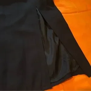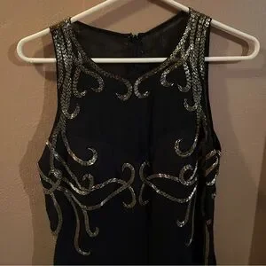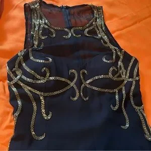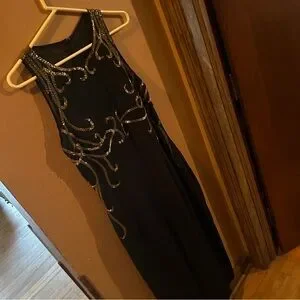 Stunning Black Dress by Alyce. Gold trim design on top. Top is silk. Skirt has front slit. No size tag, but the measurements indicate a Medium.