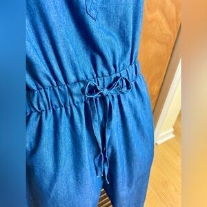 Stylish blue denim jumpsuit perfect for casual outings. Features a comfortable fit, elastic tie waist, cuffed legs and button down style.