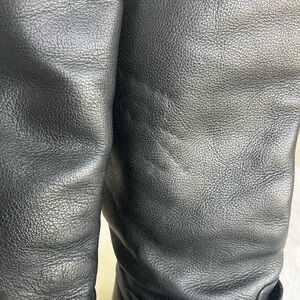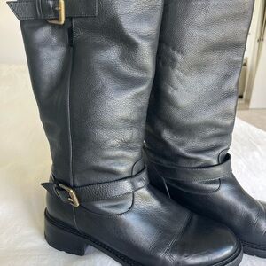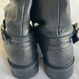 Fendi biker boots feature a rugged design with a chunky treaded rubber sole and a decorative buckle strap with gold hardware. black leather, round toe, lined, gorgeous! Mild wear throughout, very gently used. Creasing at toe box Lots of wear left in these beauties! Perfect and versatile for year round wear. Buckle is brassy gold. See photos