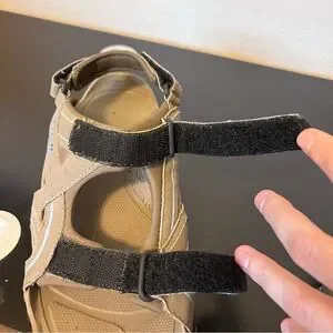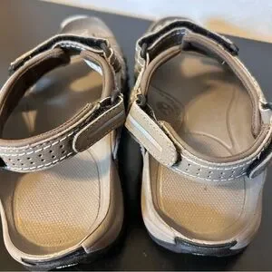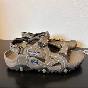 Step into adventure with Timberland's tan sandals, crafted for outdoor enthusiasts. These sandals feature multiple adjustable velcro straps for a secure fit and a durable rubber sole for excellent traction on various terrains. Designed with a contoured footbed, they offer unparalleled comfort for all-day wear. EUC. Logo is rubbed off the back of one shoe. Velcro is clean & fully functional.