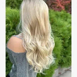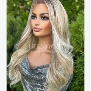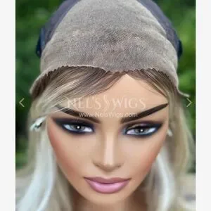 Only tried on Nel’s Emmie blonde wig standard size. There is some root touch up spray on the ear tabs and they have been trimmed . It is an open part . Heat friendly synthetic . Beautiful