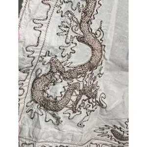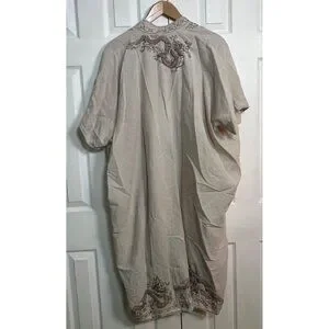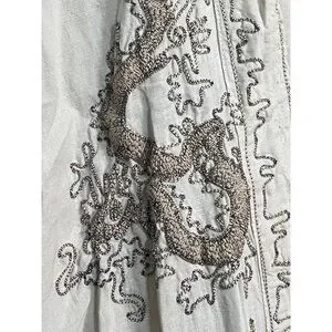 This stunning open-front kimono by Magnolia Pearl is crafted from lightweight European linen in a soft, neutral hue. The design features intricate dragon embroidery in deep earthy tones along the front panels and shoulders, giving the garment an ornate and mythical flair.