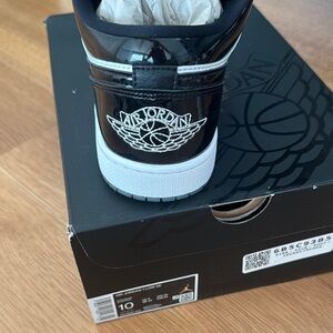 Experience the perfect blend of style and comfort with these Jordan sneakers. Featuring a classic black and white colorway, these low-top shoes boast a sleek design with a white leather base and contrasting black overlays. The iconic Jumpman logo and perforated toe box add to their timeless appeal.