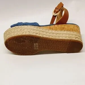 Featuring a chic blue fabric upper and tan leather straps, these sandals are perfect for any occasion. The comfortable wedge design adds height without sacrificing comfort.