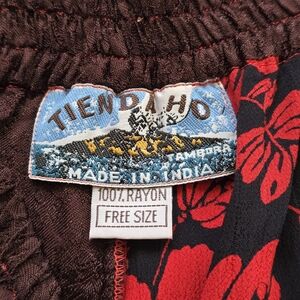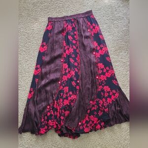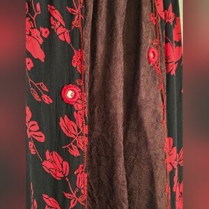 Gorgeous high-quality, bohemian, vintage-style skirt by Tienda Ho. This flowy, eye-catching piece features alternating panels of rich maroon crinkle fabric and black floral print with vibrant red embroidery. Delicate crochet-style silver buttons add an extra charm to the front. Super flattering with an elastic waistband—comfortable and easy to wear!
