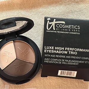 IT brand eight pieces included. Two eyeshadow trios, one Superhero mascara, two lip serums, one tight line eyeliner/mascara, one universal brow pencil, and cosmetic bag.
