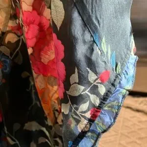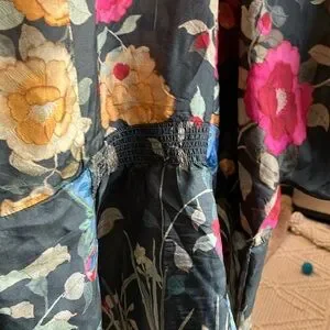 Elegant floral design by Johnny Was. Features vibrant pink and yellow tones.